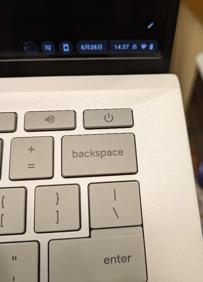 ASUS ExpertBook Chromebook Plus CX54を立ち上げるとき、電源ボタンを探した。今までのChromebookでは側面側にボタンがあった。CX54はキーボードトップキー列の右端に電源ボタンがあった。